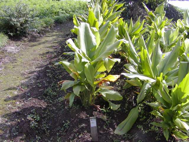 | 2004年5月 隣の農家から分けてもらった種を植えました。 畝はば:120cm 株間:80cm 深さ:15cm 元肥:牛糞、鶏糞、過燐酸石灰 5月 3日 芽出しをして植え付けました。 7月24日 雑草の中から復活です。雑草に負けていくつか消えてしまいました。 11月6日 葉が黄色になってきた。もう少しで収穫時期 12月4日 霜で葉が枯れ始めた。そろそろ収穫時期。12月12日に収穫予定 12月23日 ウコンの収穫がおわりました。 来年の種用に、地面を50cm程度の穴を掘り埋めました. 収穫したものはおろしがねで摺って小匙1杯分くらいを、焼酎にいれて飲んで います。翌日は快調!! |